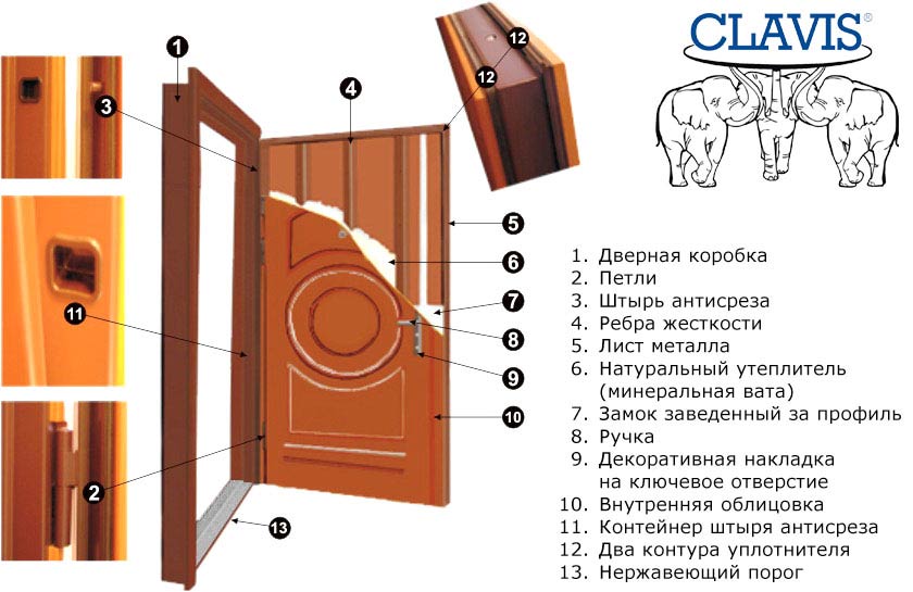 У дверей «Клавис» нет класса взломостойкости и стандартизации — все делается на заказ так, как нужно заказчику с нужным уровнем взломостойкости, размерами, замками и т. д. В целом строение дверей компании основывается на базовой конструкции, которая может быть изменена.