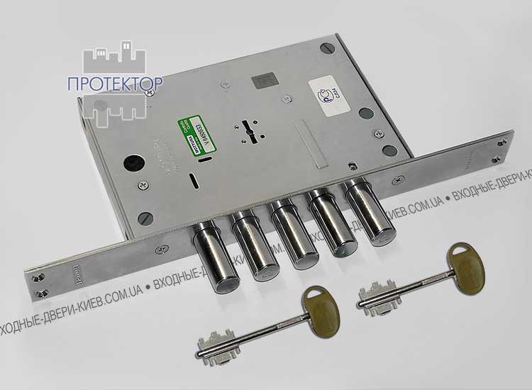У комплект, крім замка, входить запірна планка, внутрішня та зовнішня декоративні накладки, набір із п'яти ключів.