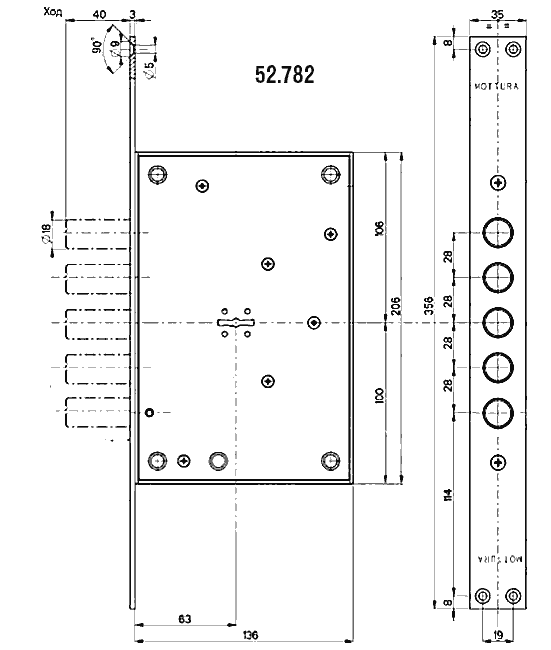 Модель 52-ї серії без защіпки та ручки. Основне призначення — експлуатація у важких сталевих дверях та конструкціях зі сталі. Замок підходить до правих та лівих дверей, виготовлених в Італії.