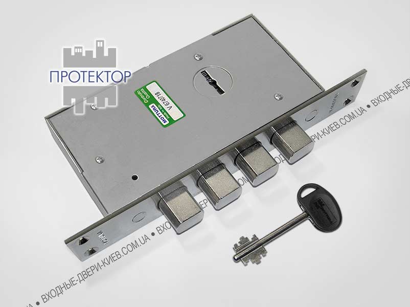 У комплект, крім замка, входить запірна планка, дві декоративні накладки та набір із п'яти ключів.