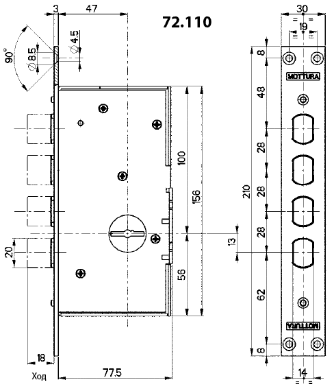 Однообертний легкий замок 72-ї серії із сугальдним секретним механізмом для дверей правого та лівого відчинення. Може експлуатуватися у дверях всіх видів та інших місцях, де використання моделі буде доцільним. Виготовлений в Італії.