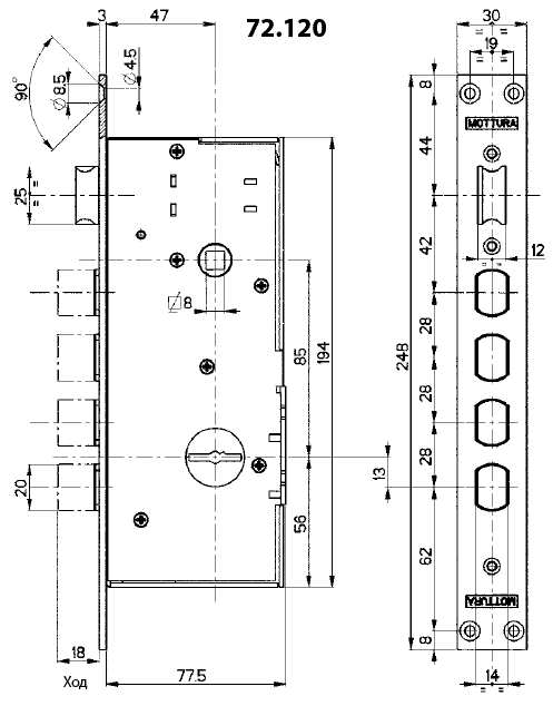 Однообертний легкий замок 72-ї серії із сугальдним секретним механізмом для дверей правого та лівого відчинення. Може експлуатуватися у дверях всіх видів та інших місцях, де використання моделі буде доцільним. Виготовлений в Італії.