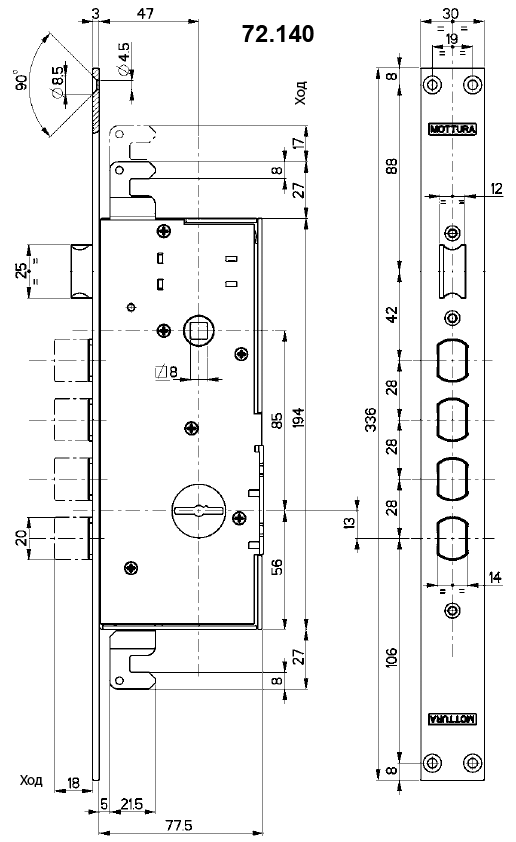 Однообертний легкий замок 72-ї серії із сугальдним секретним механізмом для дверей правого та лівого відчинення. Може експлуатуватися у дверях всіх видів та інших місцях, де використання моделі буде доцільним. Виготовлений в Італії.