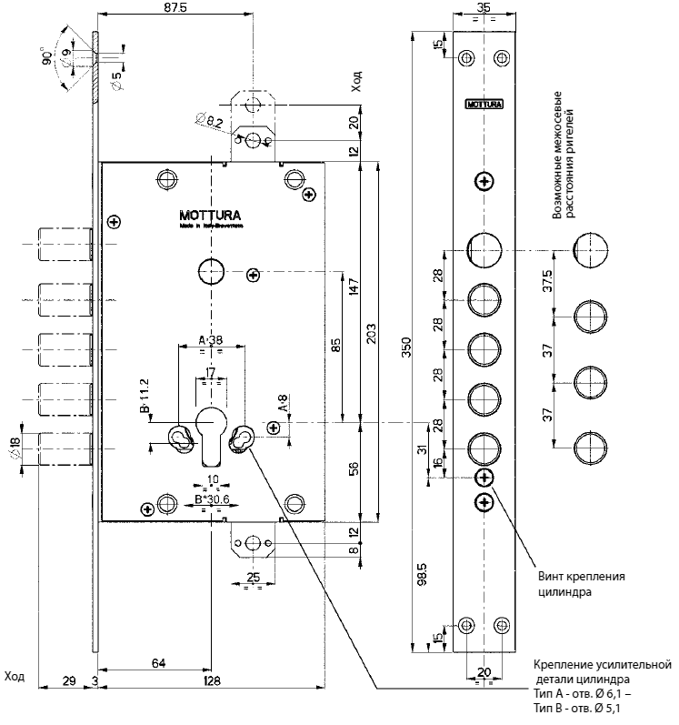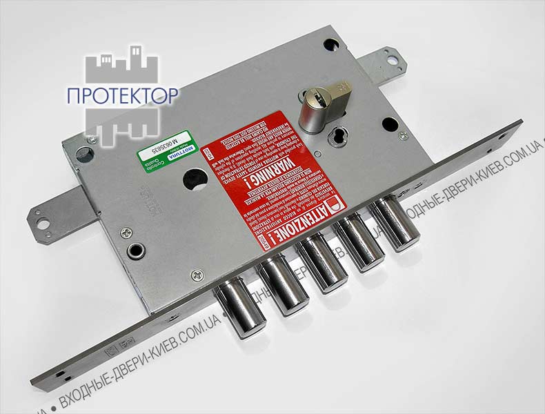Циліндрова модель 84-ї серії без защіпки, з блокуванням ригелів при вилученні циліндра. Основне призначення — експлуатація у важких сталевих дверях. Виготовлений в Італії.