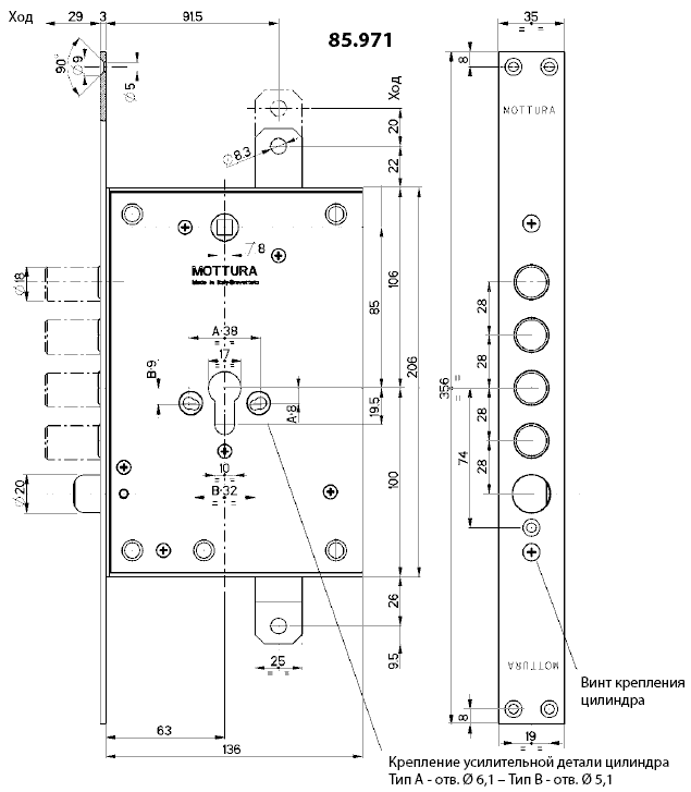 Циліндрова модель 85-ї серії з блокуванням циліндра, защіпкою та керуванням фалевою ручкою. Основне призначення — експлуатація у важких сталевих дверях. Виготовлений в Італії.