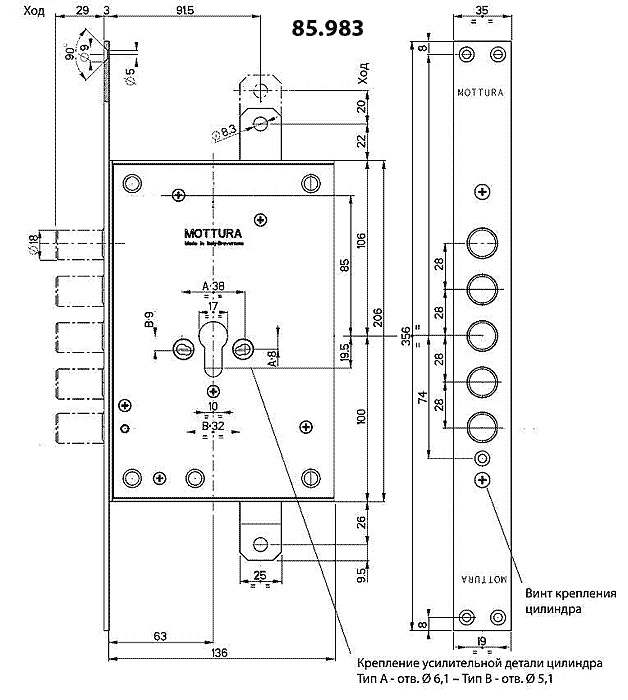 Циліндрова модель 85-ї серії із блокуванням циліндра. Основне призначення — експлуатація у важких сталевих дверях. Виготовлений в Італії.