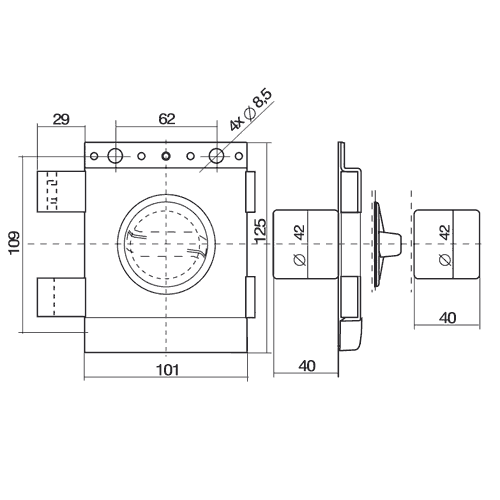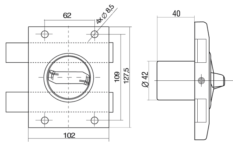 Модифікація з двома циліндрами, що відкривається зсередини та зовні ключами. Область використання — ворота, хвіртки та двері, де потрібний такий вид доступу.